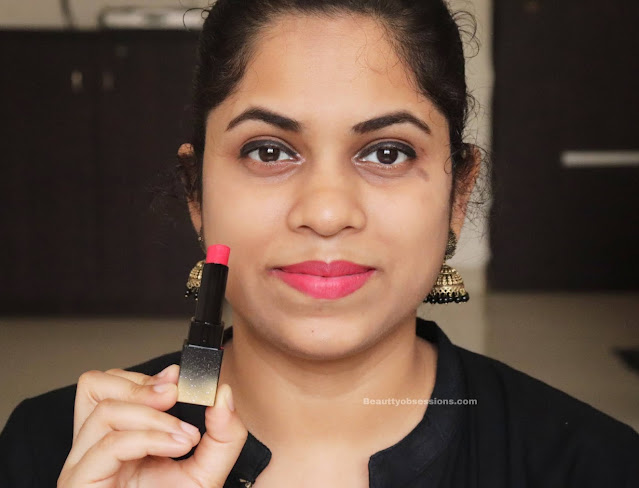 The shade Pink Up is a beautiful warm musical note pink shade . The shade is a dupe of MAC Relentlessly Red . The texture is shine, soft, creamy together with hydrating. It glides and so smoothly on lips together with settles into a powdery matte complete expect . It doesn't settle into the finelines of lips afterwards applying properly. As it is a matte lipstick, yous take to operate chop-chop patch applying this on lips . It dries out within seconds in addition to gives a dainty matte finish result . This doesn't experience heavy on lips in addition to non transferred much likewise.